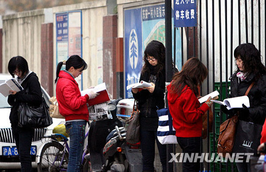 11月29日,考生在上海徐汇区零陵中学考点外抓紧时间看书复习。当日,2010年度中央机关及其直属机构公务员录用考试公共科目笔试在全国各省会城市、自治区首府、直辖市和部分较大的城市同时举行,预计将有100万人参加考试。2010年度中央机关及其直属机构公务员录用考试,共有130多个中央机关及其直属机构和参照公务员法管理的单位面向社会公开招考,计划招收1.5万余人。