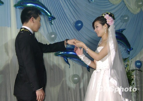图为杜丽为庞伟戴上戒指。中新社发 吕子豪 摄