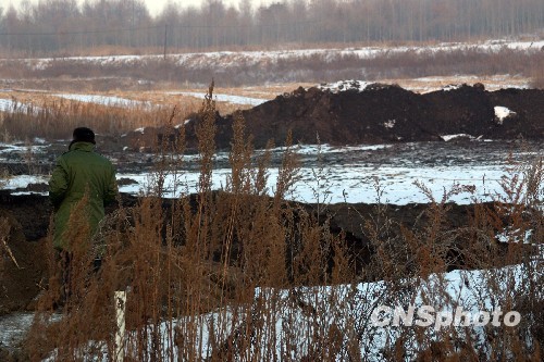在事发煤矿附近,溃水造成地面出现一个巨大的塌陷坑。中新社发 吴兆飞 摄