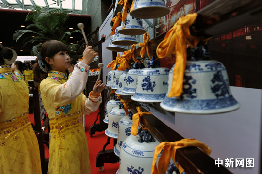 图为开幕式上演员演奏“陶瓷编钟”。中新网记者 金硕 摄