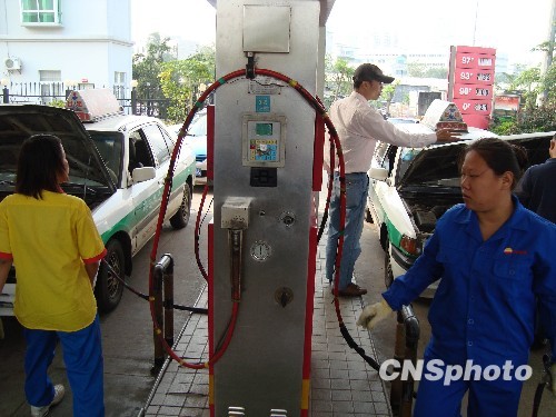 11月30日,海口市城西路一处中国石油加油站天然气供不应求,等待加然气的出租车在城西路及坡巷路排起数千米的长队。