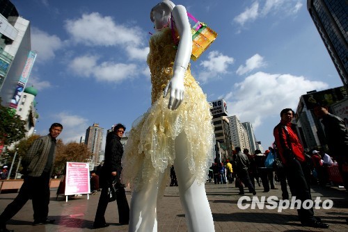 云南疾病防控中心把一件用500多个安全套做的外衣穿在塑料模特身上,用于警示人们注意使用安全套,防治艾滋病的感染。中新社发 刘震 摄