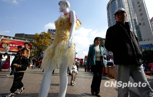 云南疾病防控中心把一件用500多个安全套做的外衣穿在塑料模特身上,用于警示人们注意使用安全套,防治艾滋病的感染。中新社发 刘震 摄