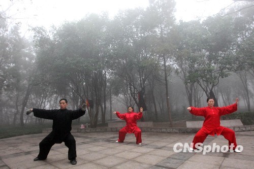 2009年12月1日,淮北市民在大雾中晨练。当日,安徽淮北市遭遇大雾天气,城区部分路段能见度不足50米,气象台发布大雾预警信号。受大雾影响,途径淮北境内的合徐高速等路段暂时封闭。