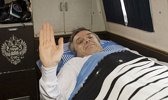 加拿大宇航员罗伯特·瑟斯克在哈萨克斯坦阿尔卡雷克附近着陆后在一辆车内休息。