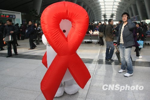 12月1日,中国红十字会志愿者扮成“红丝带”卡通人的形象在北京南站向旅客宣传“世界艾滋病日”及防治艾滋病知识。当日是第22个“世界艾滋病日”,中国红十字会与铁道部联合组织开展全国省会城市火车站和旅客列车世界艾滋病日宣传活动。中新社发 苏丹 摄