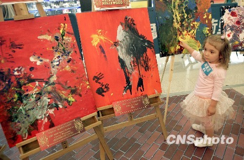 十二月二日,为了让港人感受不一样的圣诞艺术气氛,香港荷里活广场专程从澳洲邀请了两岁天才画家——埃丽塔·安德鲁来港,与父母一同为她全球首个画作展览进行揭幕。图为天真活泼的两岁天才画家——埃丽塔·安德鲁在她天赋的抽象派画前。中新社发 张勤 摄