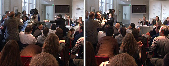 12月1日,因向布什扔鞋而“声名大噪”的伊拉克记者蒙塔兹·扎伊迪在法国巴黎出席新闻发布会时遭遇一名反对者掷鞋。