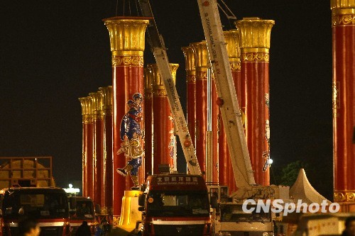 12月3日凌晨,北京天安门广场上象征民族大团结的56根民族团结柱,经北京住总集团等单位的施工,已从天安门广场全部拆除,进行回厂维护。国庆六十周年庆典期间,分列在天安门广场两侧的民族团结柱受到全国各族人民的喜爱,成为节日一道亮丽的风景。为了永久留存这56根民族团结柱,北京市政府决定将它们拆除迁移回厂,进行妥善维护后再择地安放。 中新社发 富田 摄