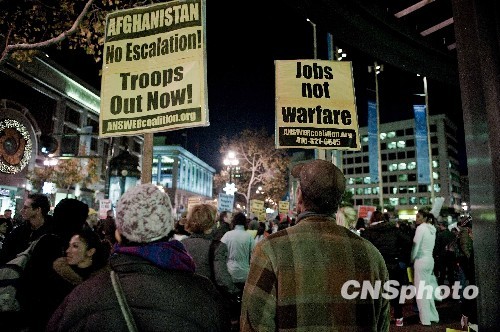 图为旧金山民众在市中心集会,反对奥巴马增兵阿富汗,要求立即结束侵略战争,让士兵回家。中新社发 陈钢 摄