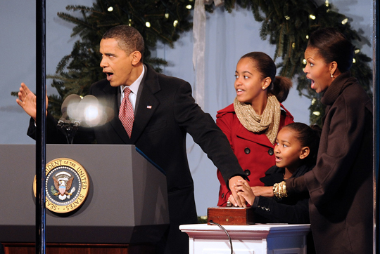 12月3日,美国华盛顿,美国总统奥巴马与家人按下按钮,点亮白宫的圣诞树。