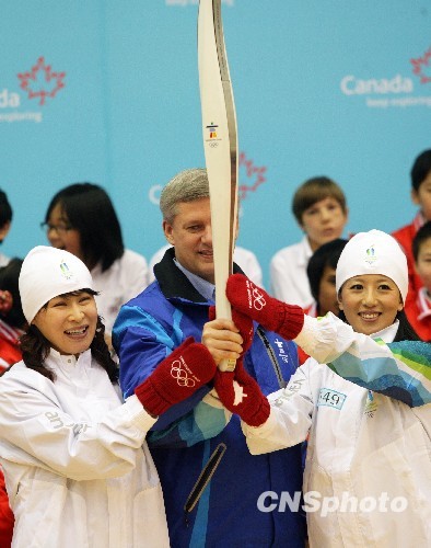 图为哈珀与叶乔波、杨扬展示温哥华冬奥会火炬。中新社发 刘震 摄