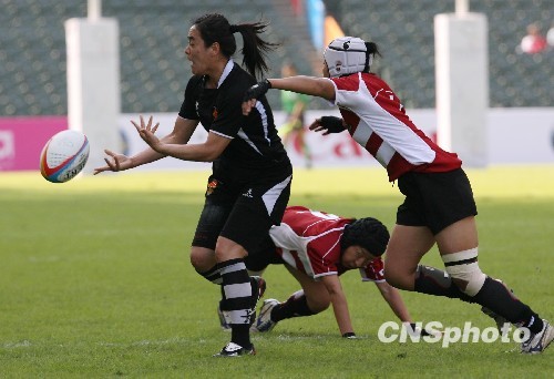 在首场开锣赛中,中国女队(黑)以二十四比零胜日本队。中新社发 郑祚声 摄