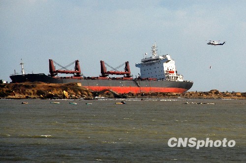 一架参加救援的直升飞机在遇险船只旁实施救援。中新社发 海云飞 摄