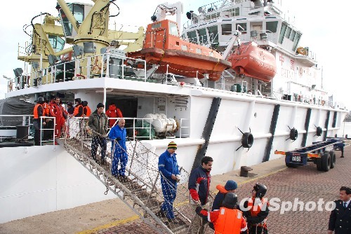获救的外籍船员走下救助船。中新社发 海云飞 摄