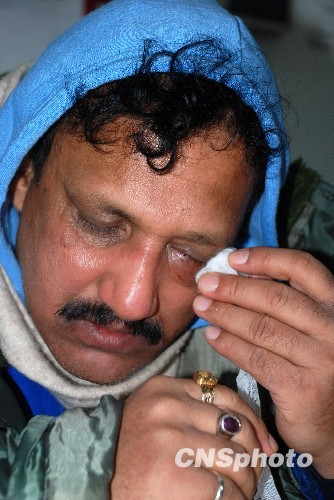 一名获救的外籍船员在威拖21号拖轮上擦拭受伤的眼部。中新社发 海云飞 摄