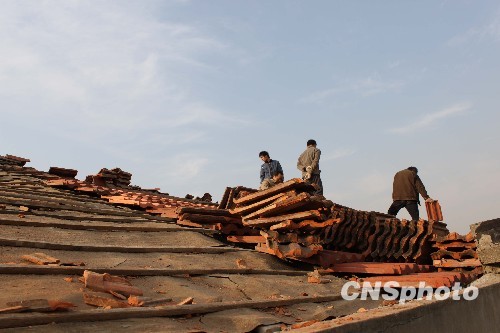 图为孝感孝南区三汊镇涂店村村民黄亚军正在清理被震坏的瓦片。中新社发 艾启平 摄