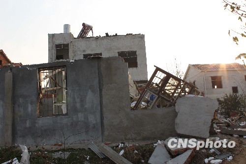 图为孝感孝南区三汊镇岳岗村村民汤女士家的猪舍被毁。中新社发 艾启平 摄