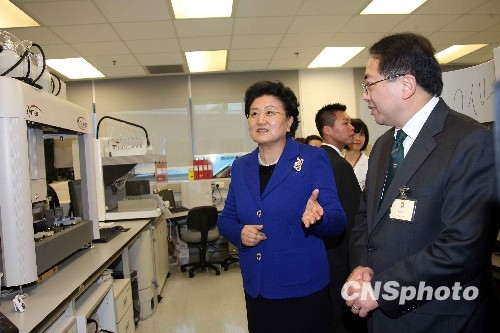 刘延东到香港大学医学院视察,在校长徐立之陪同下参观香港大学基因研究中心。中新社发 洪少葵 摄