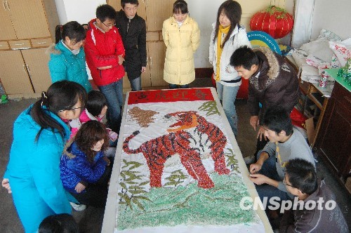 12月6日,山东聊城大学新农科技社的大学生们在欣赏制作完工的种子画《寅虎迎春》。为迎接新年到来,聊城大学新农科技社20名大学生利用课余时间共同制作了一幅种子画《寅虎迎春》。画高2.4米,宽1.5米,共用了大叶黄杨、栾树、大米、绿豆等植物的62010粒种子拼合而成。