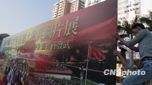 2009年12月6日,施工人员在澳门金莲花广场进行紧张的施工布展。由中国新闻社主办的新中国60年首都大阅兵图片展将于12月7日在这里开幕。该展览用165幅图片,将1949年至2009年间的14次首都大阅兵盛况浓缩再现于人们眼前。