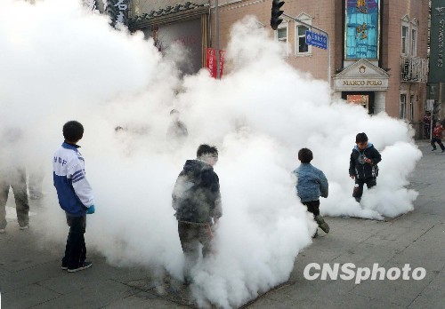 2009年12月6日,北京王府井步行街热力井冒出滚滚的白色蒸汽,让大街“云雾缭绕”。中新社发 玉龙 摄
