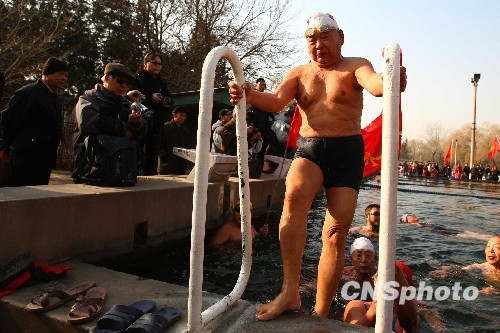 图为耄耋老人冬泳队的队员以冬泳的方式强健身体。中新社发 富田 摄