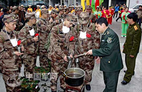 图为12月5日,第二批进藏新兵起运前,武装部后勤科科长代寿勇在给新兵分发药汤时的场面。朱志斌 摄