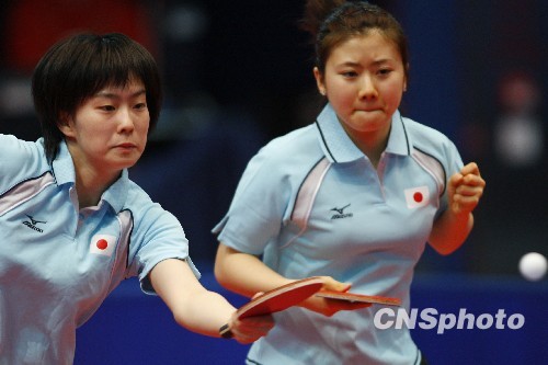 12月7日,2009年东亚运动会乒乓球比赛进入了最后一天的争夺,在女双半决赛中,日本选手福原爱/石川佳纯4-2战胜了中国香港选手林菱/张瑞,与另一对日本组合藤井宽子/若宫三纱子会师决赛。图为福原爱和石川佳纯在比赛中。中新社发 盛佳鹏 摄