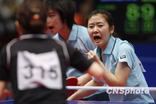 12月7日,2009年东亚运动会乒乓球比赛进入了最后一天的争夺,在女双决赛中,日本选手福原爱/石川佳纯战胜另一对日本组合藤井宽子/若宫三纱子,最终摘得金牌。图为福原爱和石川佳纯在比赛中。中新社发 盛佳鹏 摄