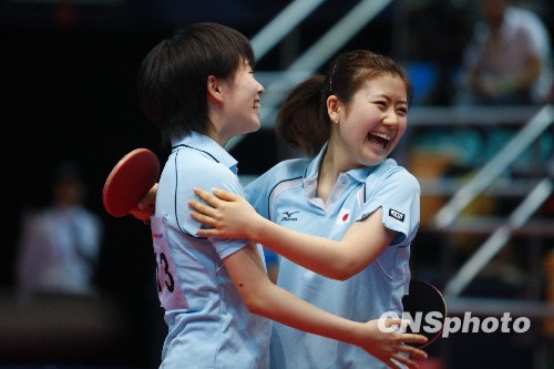 图:东亚运动会福原爱组合乒乓球女双夺金(2)