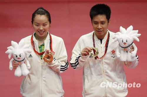 12月7日,香港东亚运动会乒乓球比赛进行最后一天的争夺,混双决赛在两对香港选手之间进行,最终高礼泽、帖雅娜4-0战胜唐鹏、姜华珺,获得金牌。中新社发 盛佳鹏 摄