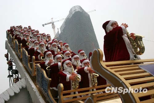 圣诞节即将来临,湖北汉口武汉广场商圈,各种圣诞扎景都已就位,最特别的是坐满圣诞老人的过山车,吸引众多过往市民的目光。 中新社发 孙新明 摄
