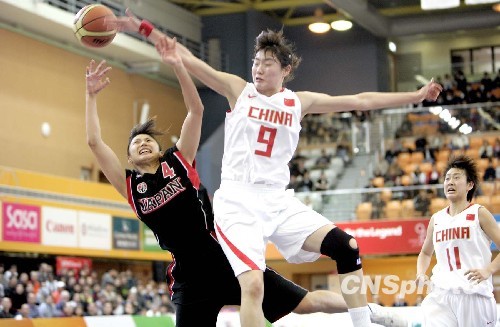 第五届东亚运女篮半决赛十二月八日在香港西区公园体育馆举行,中国队以七十九比七十七战胜日本队。图为中国队球员防守日本队球员。中新社发 张勤 摄
