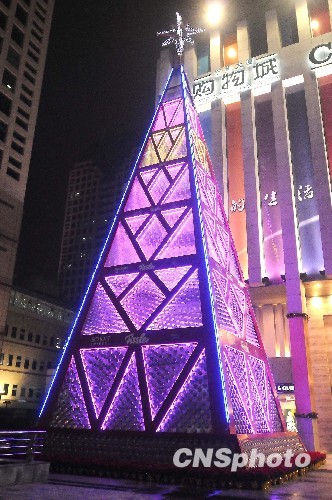 12月9日,一棵高达25米的餐具圣诞树竖立在杭州街头,该圣诞树由14000只锅、水杯、红酒杯搭建而成。圣诞节将至,杭州各商场圣诞气氛渐浓,以争食“圣诞经济”这块大蛋糕。 中新社发 引炜 摄