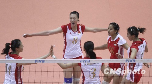 图为中国女排队员庆祝得分。中新社发 盛佳鹏 摄