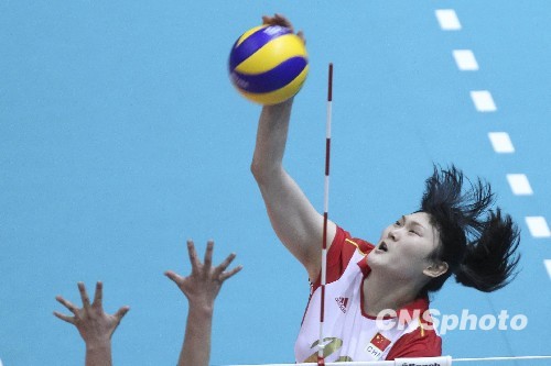 图为中国女排10号王一梅在比赛中重扣。中新社发 盛佳鹏 摄