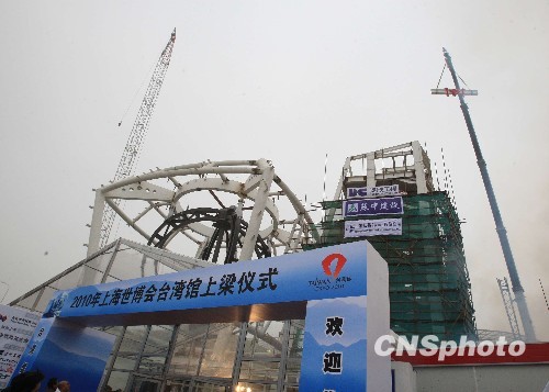 12月10日,2010年上海世博会台湾馆举行结构封顶仪式。上海世博局局长洪浩、海协会副会长张铭清、台北世贸中心董事长王志刚以及上海台商代表出席仪式。台湾馆以“山水心灯——自然心灵城市”为主题,预计明年3月底完工,4月1日开始试运营。中新社发 潘索菲 摄