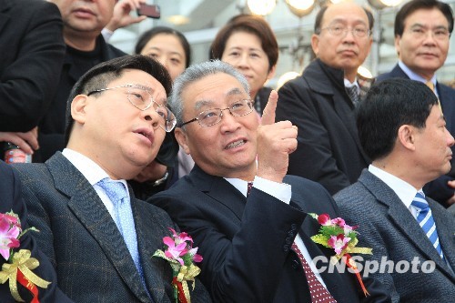 12月10日,2010年上海世博会台湾馆举行结构封顶仪式。海协会副会长张铭清(右)与上海市台办主任李文辉出席仪式。台湾馆以“山水心灯——自然心灵城市”为主题,预计明年3月底完工,4月1日开始试运营。中新社发 潘索菲 摄