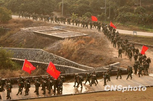 十二月十日,武警广州指挥学院近五百名官兵结束了为期十一天的千里野营综合演练,官兵在广东东莞市大岭山山区险山峻岭的复杂地形中,组织捕歼战斗、反恐怖袭击、解救人质、野外生存等实战性训练,为反恐处突、广州亚运安保、春运执勤等蓄势备战。中新社发 陈海锋 摄