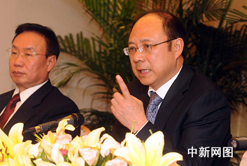 12月10日中午,海协会常务副会长郑立中(右)在福州举行的新闻发布会上介绍,海协会代表团将于十二月二十一日中午抵达台中,二十二日海协会会长陈云林与海基会董事长江丙坤举行会谈,协商解决两岸渔船船员劳务合作、两岸农产品检验检疫合作、两岸标准计量检验认证合作、两岸避免双重征税及加强税务合作等问题。