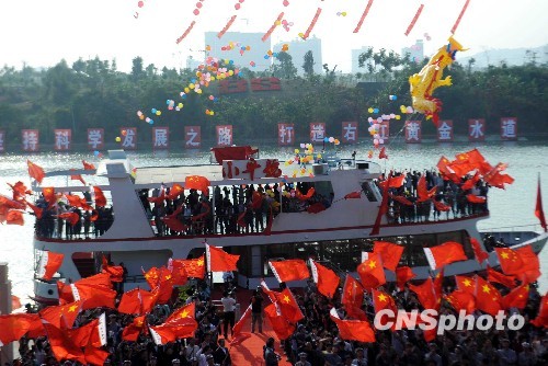 十二月十一日,广西举行百色起义八十周年纪念大会。“小平号”红船亦于当日启航。80年前,邓小平乘船来到百色领导了百色起义。如今,广西方面特意修建了这艘能乘坐上百人的游艇,游客可以按照当年邓小平进入百色境内的线路,重走“小平路”,欣赏沿江风光。中新社发 蒋雪林 摄