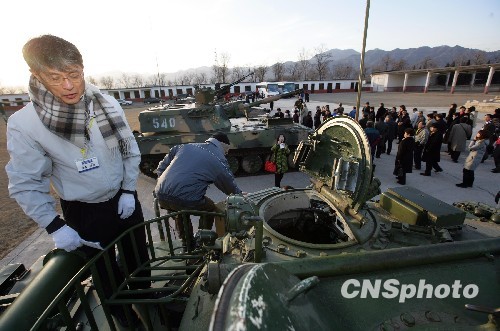12月11日,日本民主党访华团部分团员应邀前往北京驻军某装甲师参观。图为成员们到装甲车上参观。中新社发 刘震 摄