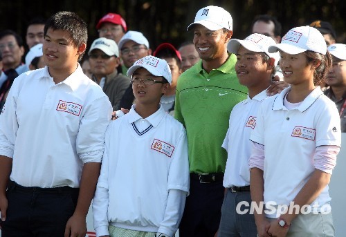 资料图为11月4日,“老虎”伍兹在上海与小球员亲密接触。中新社发 汤彦俊 摄