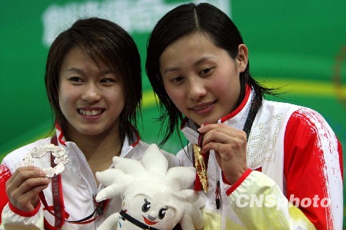十二月十二日下午,东亚运跳水女子3米跳板决赛在香港九龙公园游泳池举行,中国选手屈琳(右)、刘娇(左)包揽冠亚军。中新社发 张勤 摄
