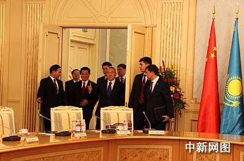 当地时间十二日下午,正在对哈萨克斯坦进行工作访问的中国国家主席胡锦涛与纳扎尔巴耶夫总统先后举行小范围和大范围会谈。图为两国元首谈笑着走进总统府会谈厅。作 者:张朔