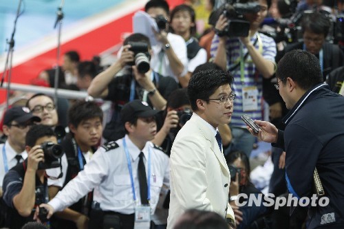 12月13日,2009香港东亚运动会进入最后一个比赛日,“跳水女皇”郭晶晶与老搭档吴敏霞携手亮相女子双人三米板决赛。最终这对奥运冠军组合毫无悬念的获得了冠军。图为观看郭晶晶比赛的霍启刚成为媒体采访焦点。中新社发 盛佳鹏 摄