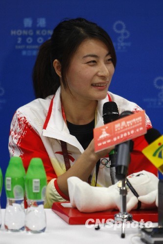12月13日,2009香港东亚运动会进入最后一个比赛日,“跳水女皇”郭晶晶与老搭档吴敏霞携手亮相女子双人三米板决赛。最终这对奥运冠军组合毫无悬念的获得了冠军。图为郭晶晶笑对记者提问。中新社发 盛佳鹏 摄