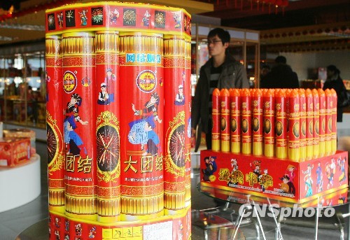 12月14日,北京一家烟花爆竹批发单位摆上了今年的两款新品“民族柱烟花”。56根民族柱是国庆六十周年天安门广场上的靓丽风景,这款模仿民族柱的烟花高达一米,还能制造出国庆晚会的“网幕烟花”效果。