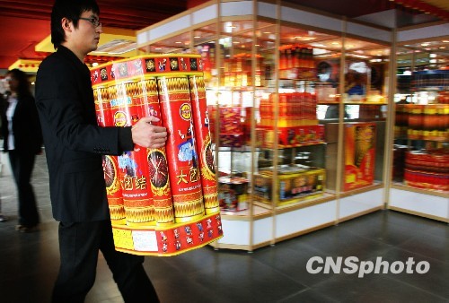 北京一家烟花爆竹批发单位的工作人员正在搬运今年的新品“民族柱烟花”。中新社发 苏丹 摄